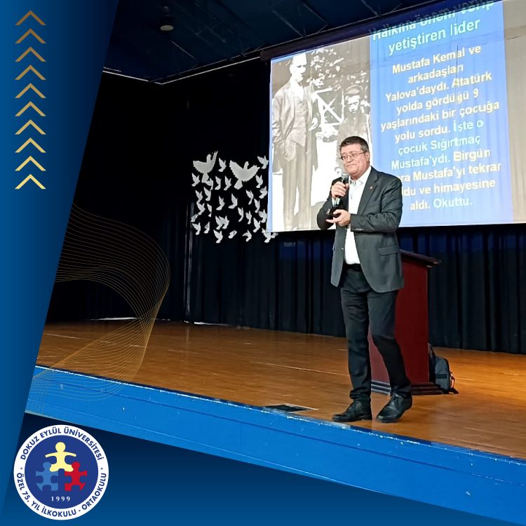 Dokuz Eylül Üniversitesi Atatürk İlkeleri ve İnkılap Tarihi Enstitüsü Öğretim Üyesi Prof. Dr. Mehmet Emin Elmacı, Atatürk’ü Anma Haftası kapsamında okulumuzda “Mustafa Kemal Atatürk ve Liderlik Özellikleri” başlıklı sunumlarını gerçekleştirdi.