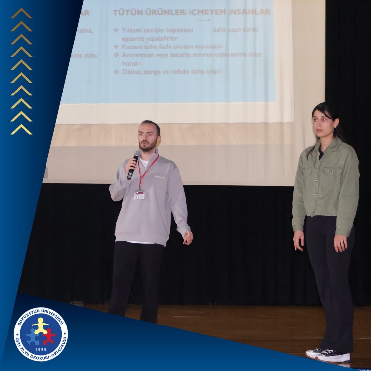 Okulumuzda “Dumansız Hava Sahası ve Sigaranın Zararları/ Hastalıklarla İlişkisi” konulu sunum beden eğitimi öğretmenlerimiz tarafından gerçekleştirilmiştir. Sunumda, tütün ürünlerinin insan sağlığı üzerindeki olumsuz etkileri hakkında öğrencilerimize bilgilendirme yapılmıştır. Etkinlikle öğrencilerimizin bilinçli, sağlıklı ve aktif bir yaşam sürmeleri konusunda farkındalık kazanmaları amaçlanmıştır.
