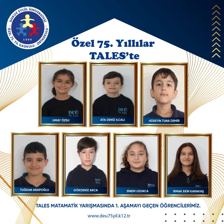 Dokuz Eylül Üniversitesi Özel 75. Yıl İlkokulu ve Ortaokulu öğrencilerimiz, "Tales Matematik Yarışması"nda gösterdikleri üstün performansla finale kalmış ve %5’lik başarı dilimine girerek bizlere büyük bir gurur yaşatmıştır.